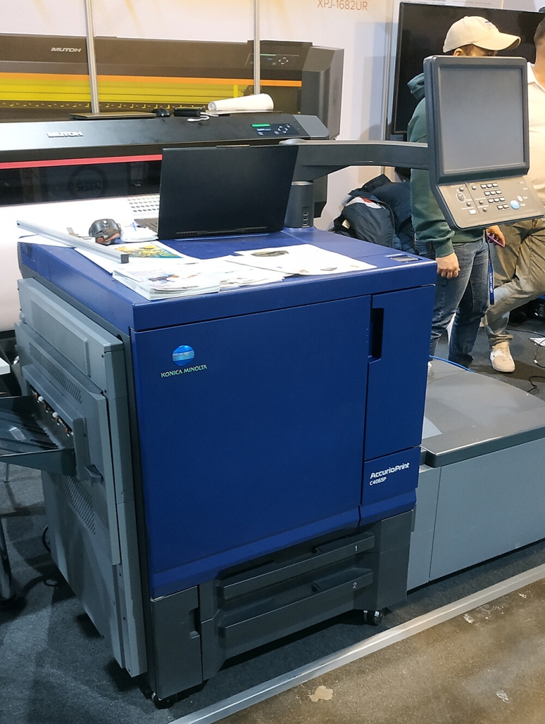 Те, кто интересовался печатным оборудованием, не могли пройти мимо стенда Logic Computer, на котором демонстрировалась цветная тонерная листовая ЦПМ Konica Minolta AccurioPress C4065P формата SRA3, которая может печатать на материалах плотностью до 360 г/м² со скоростью до 66 стр./мин. К сожалению, у компании не получилось привезти на выставку более подходящую по профилю мероприятия этикеточную ЦПМ Konica Minolta AccurioLabel 230, которая доступна в демозале представительства Konica Minolta. Причина банальна: ЦПМ не прошла по габаритам в грузовой лифт, а заказывать для её трансфера на выставку и обратно подъёмный кран оказалось весьма сложно и затратно по времени.