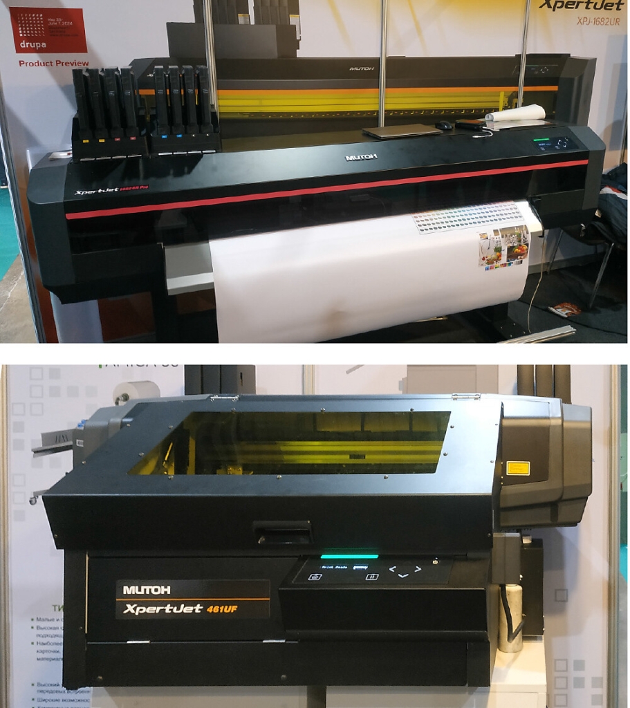 Также на стенде Logic Computer состоялся дебютный показ двух принтеров Mutoh. Одним из них был широкоформатный экосольвентный XpertJet 1682SR Pro шириной 1,6 м, оснащённый двумя печатающими головками в конфигурации CMYK×2 и печатающий со скоростью до 87 м²/ч. Рядом с ним демонстрировался настольный УФ-принтер XpertJet 461UF формата А3+ в конфигурации CMYK + W + V, предназначенный для персонализации и мелкосерийного производства с применением различных материалов толщиной до 15 см. Любопытно, что Logic Computer начала поставки чешских ламинаторов Komfi и китайских режущих плоттеров AOL, но пока они были представлены на стенде только в виде информационных баннеров. В ассортименте поставляемого оборудования Komfi предлагались ещё и фирменные системы цифрового облагораживания Spotmatic.