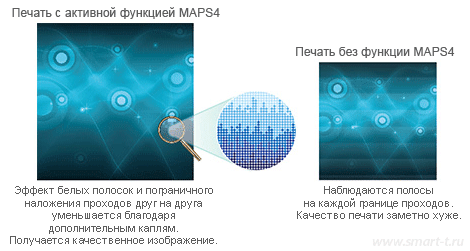 Функция компенсации межпроходных погрешностей MAPS4 (Mimaki Advanced Pass System 4)Как правило, полосы, образующиеся при каждом проходе печатающих головок, имеют четко очерченные границы, поэтому любая межпроходная несогласованность может приводить к появлению паразитных полосок и к цветовым наложениям в пограничных зонах. В принтере Mimaki CJV200 реализована уникальная функция MAPS4, в основу которой заложен самый инновационный алгоритм рассеивания дополнительных чернильных капель на участках между проходами, который позволяет устранить погрешности даже в высокопроизводительных режимах печати.