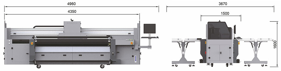 С фронтальной стороны принтера установлены система подсветки материала для контроля качества печати и система подмотки готовых отпечатков.