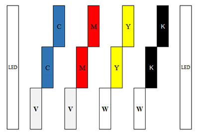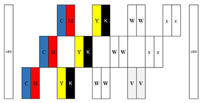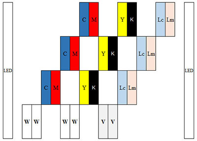 CMYK, CMYK + W, CMYK + V, CMYK + W + V, CMYK + Lc + Lm, CMYK + Lc + Lm + W, CMYK +Lc + Lm + V, CMYK + Lc + Lm + W + V
