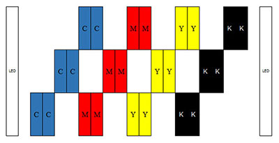 4 ряда печатающих головок, до 3 печатающих головок в каждом ряду