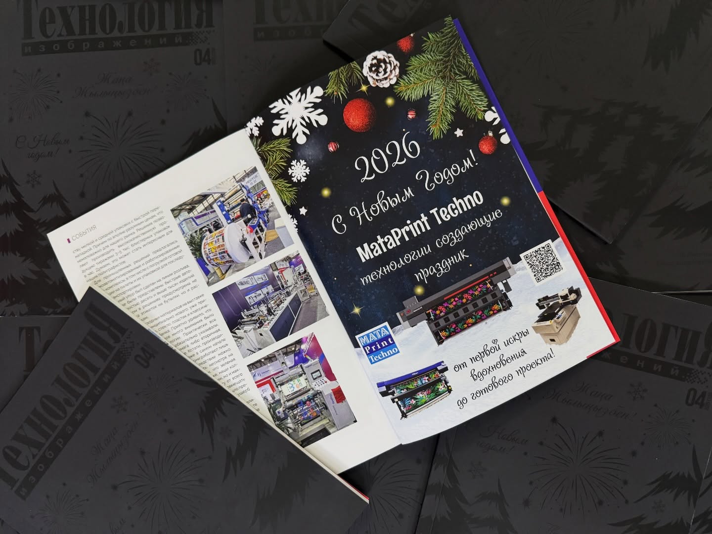 В праздничном тираже размещён новогодний баннер MataPrint Techno. Приятно, когда поздравление звучит не мимолётно, как в ленте, а остаётся напечатанным — на развороте, который можно листать, к которому можно возвращаться и который можно держать в руках. Именно так журнал доносит тёплые слова до тех, кто ежедневно живёт производством, материалами, печатью и резкой.